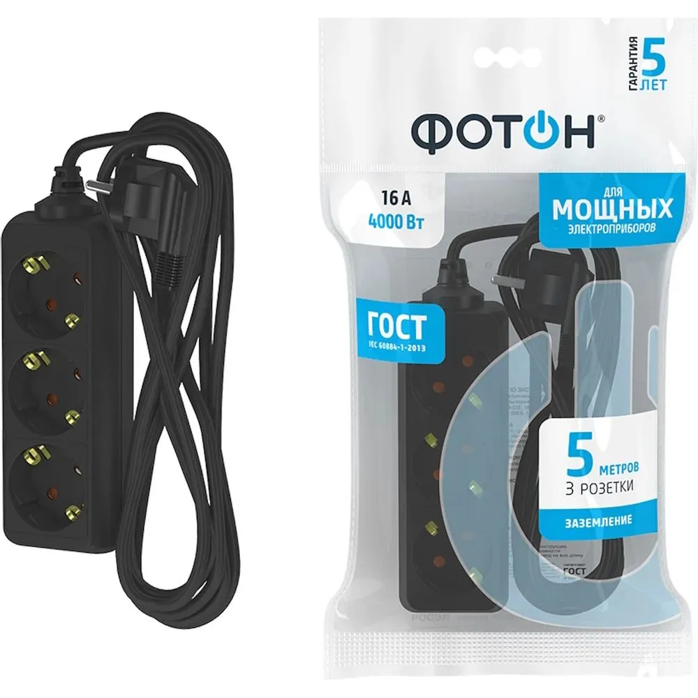 Сетевой удлинитель Фотон 16-53E 5м-16A-3гн. черный